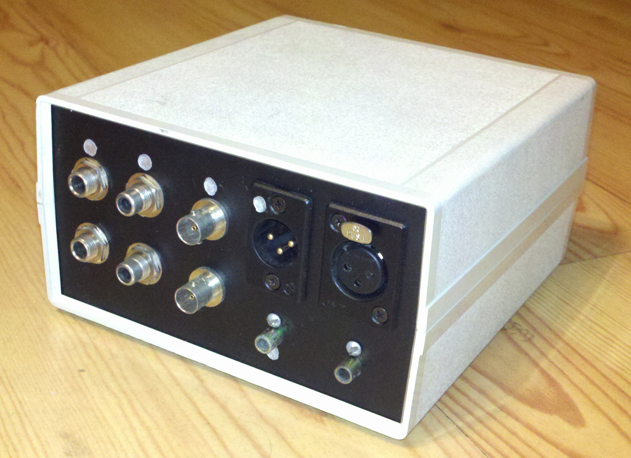 The connectors are, from left to right: quarter inch Tip-Ring-Sleeve, RCA (cinch), BNC, XLR along the top and bantam (TT) along the bottom.
