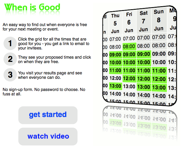 Ah but there is hope: WhenIsGood.net is a simple little website with the power to help you find a good time for everyone to meet. No email addresses required! You start by filling in all of the times you want to be considered available. Then the site gives you some links: