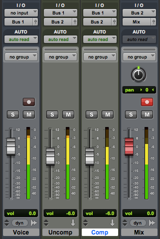 The technique from olden times is still used today, using two channels on an audio console. The tape return (or DAW output) goes to a vocal channel and is then sent on an alternate path using a buss or aux send. This secondary output is patched into a compressor then returned to a second console channel input. The uncompressed channel and the compressed channel are both mixed together. Example of Parallel Compression implemented in ProToolsIn a DAW the voice can be bussed in the box to two aux channels. Compression is added to one of the channels. The output of both channels are mixed together. In recent years we’ve seen plugins with a wet/dry mix option. This allows a single channel to pass some uncompressed plus compressed signal at the same time, simplifying the setup for parallel compression.