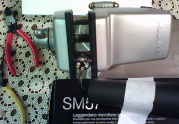 Shure SM 57 modification wires soldered to mic elment and chassisI purposely cut the drain wire short so that it would bare any stress instead of the +/- connections. Having cleaned off the old solder and tinned the terminals to the mic element, I finished the soldering by connecting the positive and negative wires. Then I dropped the sawed-off into a SABRA-SOM SSM-1 shockmount. I would have preferred something smaller, but that’s a different project!
