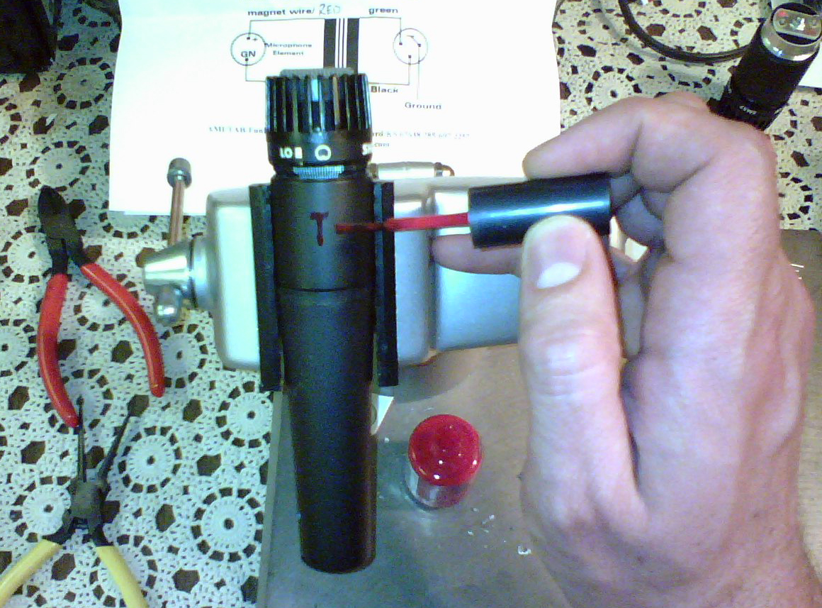 Shure SM 57 modification reattach XLR connectorShure SM 57 modification reattach mic elementI used a solder sucker to clean off the residue from the previous wiring. I tinned with some good Kester solder because cheap stuff can sound bad. I attached the XLR to the transformer leads. Then I attached the XLR connector to the base and soldered the other end of the transformer wires to the mic element.