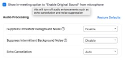 When you rollover the text to Show in-meeting option to “Enable Original Sound” from microphone, you’ll see the floating explanation shown above. Those enhancements are great most of the time, but to allow your voice acting clients to hear as much of what’s actually happening while you record, enable the checkmark.