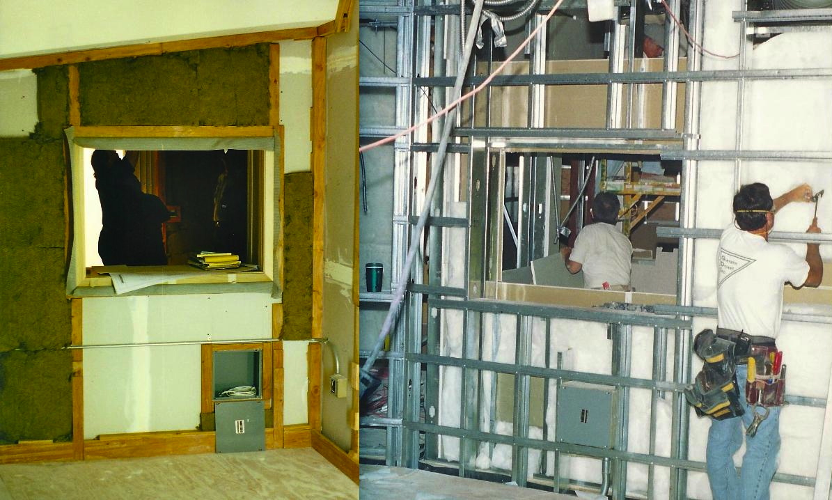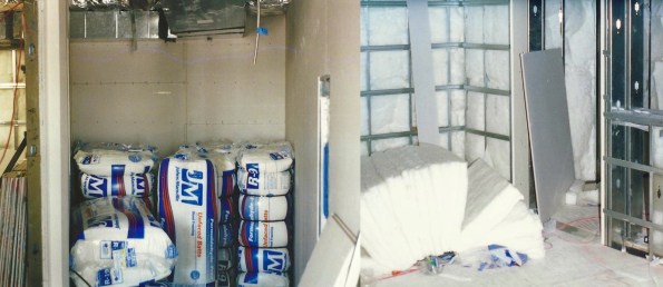 Two different types of frictional absorbers were used. On the left you can see how rock wool was cut to fit into walls with funky shapes. Also note in the junction box near the floor you can see the white pull string used to bring signal cables in from the other room.
