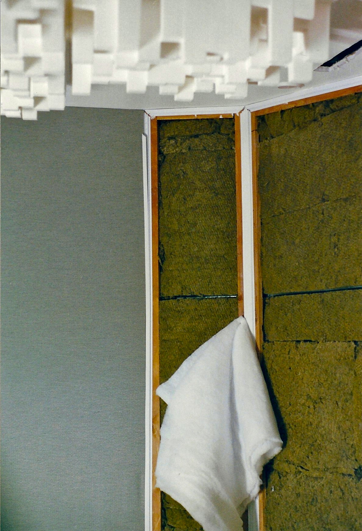 Here we see the progress from rock wool to finished fabric wall. The brown wooden framing supports the white snap track used to fasten the final layer. But first the white quilting fabric covers the rock wool. This makes the outer fabric softer to the touch and more consistent in color with cloth covered R19. To the left we see the final wall fabric.