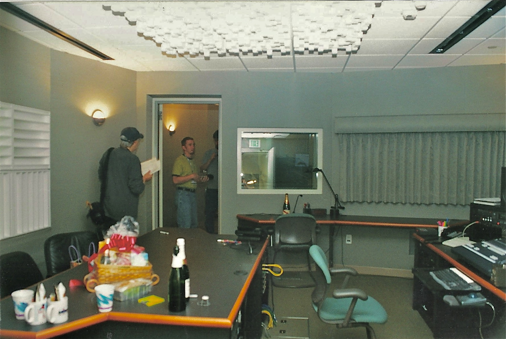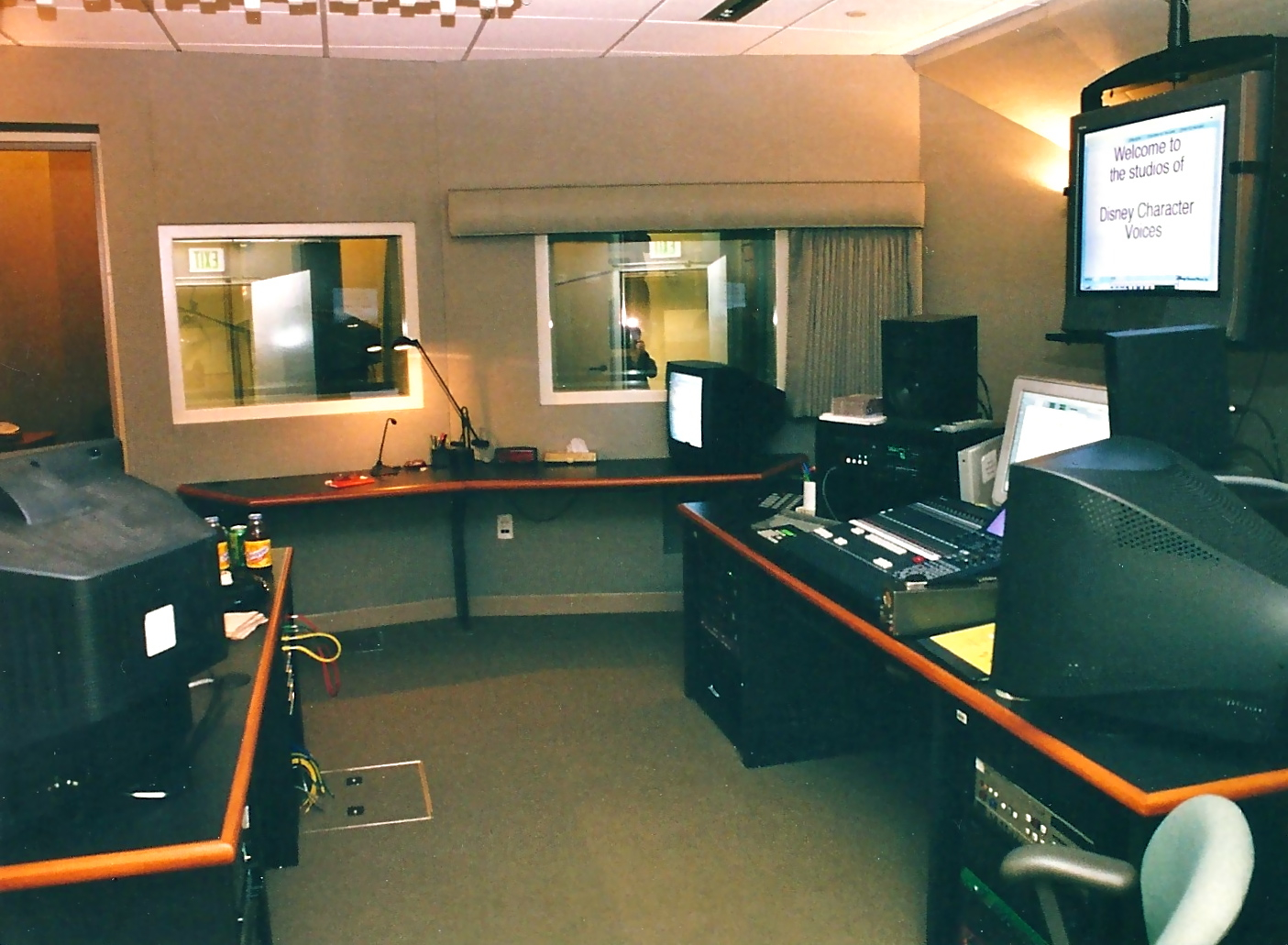 I forgot how few flat panel video monitors were used originally when the studio began operation. Eventually all but one of those CRTs were replaced. The counter top on the left is the client desk. Straight ahead we see the director's desk with talkback mic and clear sight lines into both iso booths. The engineer's position is to the right. You can see the yellow patch cables in the bays behind where the engineer would sit and a sub-floor access panel below.