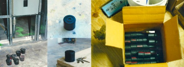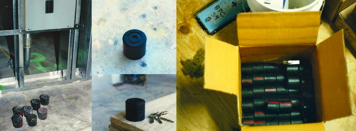 The raised floor was decoupled from the building structure using neoprene pucks. I set my car keys next to one for some sense of scale. It took a lot of them to float the entire floor.