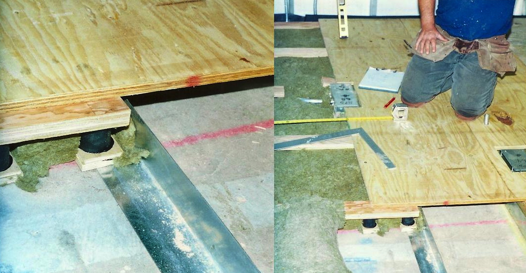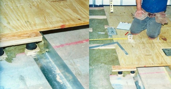 The weight of the wood above compressed the pucks significantly. The result was a springy floor, especially in the middle of the room, but it wouldn’t make you seasick just walking around. You can also see how mineral wool was used to fill in the air cavities to help prevent the floor from resonating like a drum. To the right there is no wool in the floor channel created for cable runs.